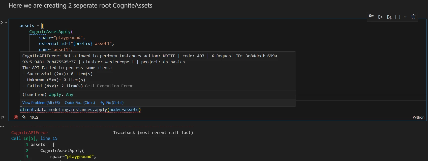 CogniteAPIError: Not allowed to perform instances action: WRITE | code: 403 | X-Request-ID: 3e84dcdf-699a-92e5-9481-7eb475505e37 | cluster: westeurope-1 | project: ds-basics The API Failed to process some items: - Successful (2xx): 0 item(s) - Unknown (5xx): 0 item(s) - Failed (4xx): 2 item(s)