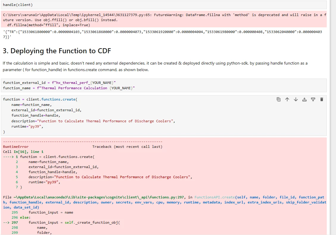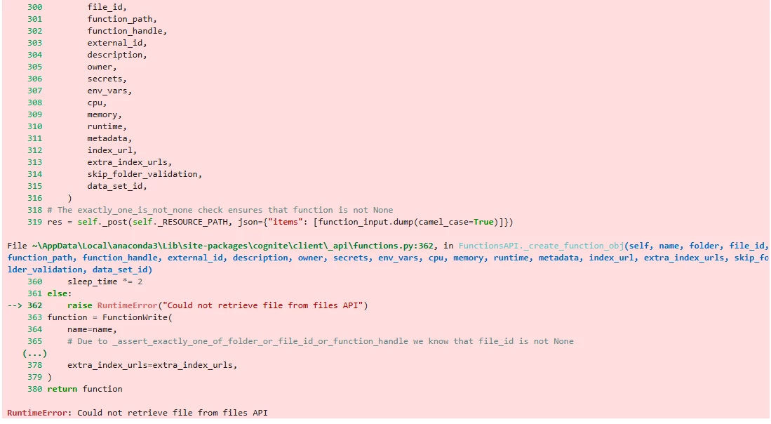 I am going through the Hands-On exercise of Cognite Functions and trying to run the code as per Notebook 2 (Deploying a Cognite Function via the SDK). I was able to create the handler function but deploying the function to CDF is throwing a Runtime Error ‘Could not retrieve the file from files API’ as shown below:
