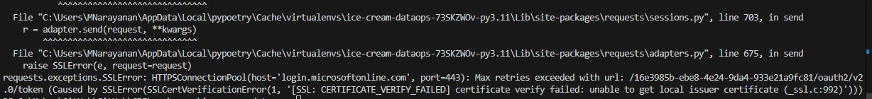 urllib3.exceptions.MaxRetryError: HTTPSConnectionPool(host='login.microsoftonline.com', port=443): Max retries exceeded with url: /16e3985b-ebe8-4e24-9da4-933e21a9fc81/oauth2/v2.0/token (Caused by SSLError(SSLCertVerificationError(1, '[SSL: CERTIFICATE_VERIFY_FAILED] certificate verify failed: unable to get local issuer certificate (_ssl.c:992)')))