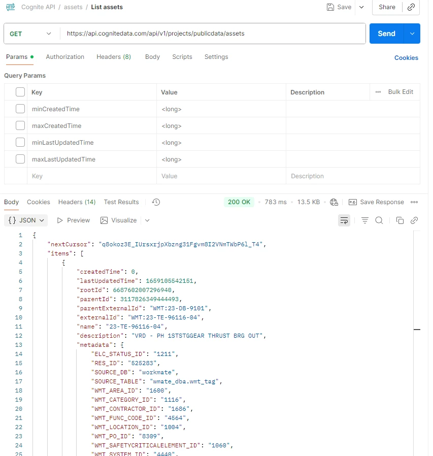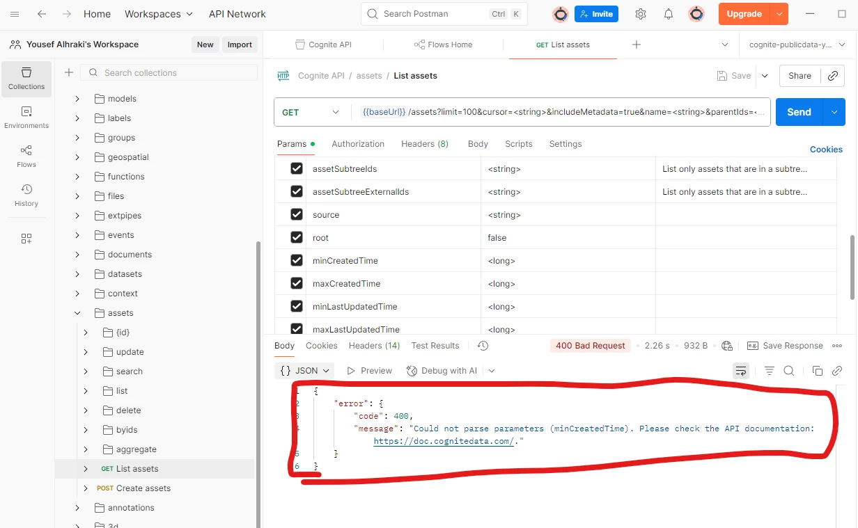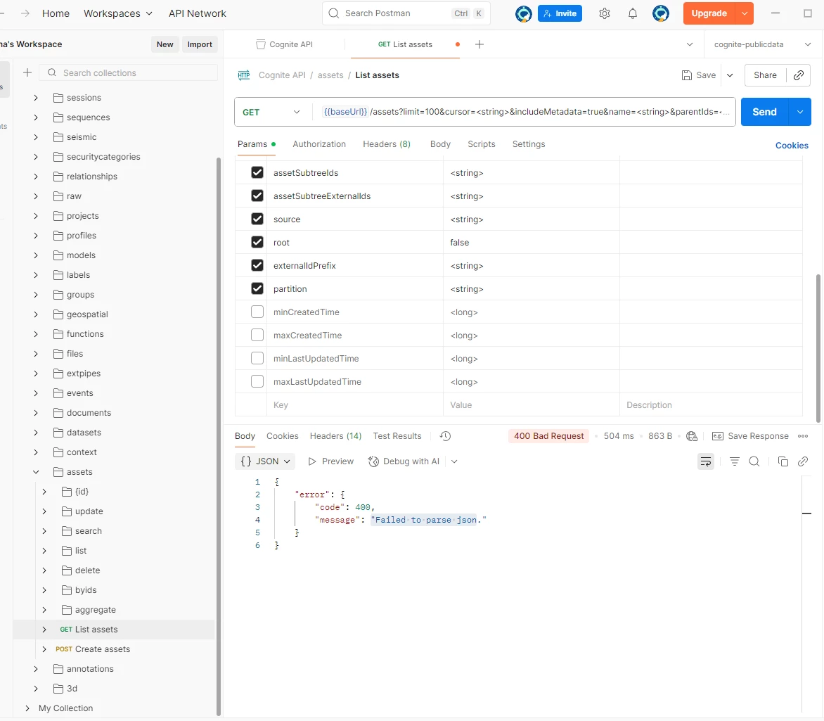 I ran into the same issue with the "List assets" request in Postman. I’m sharing a screenshot of all the parameters for reference.