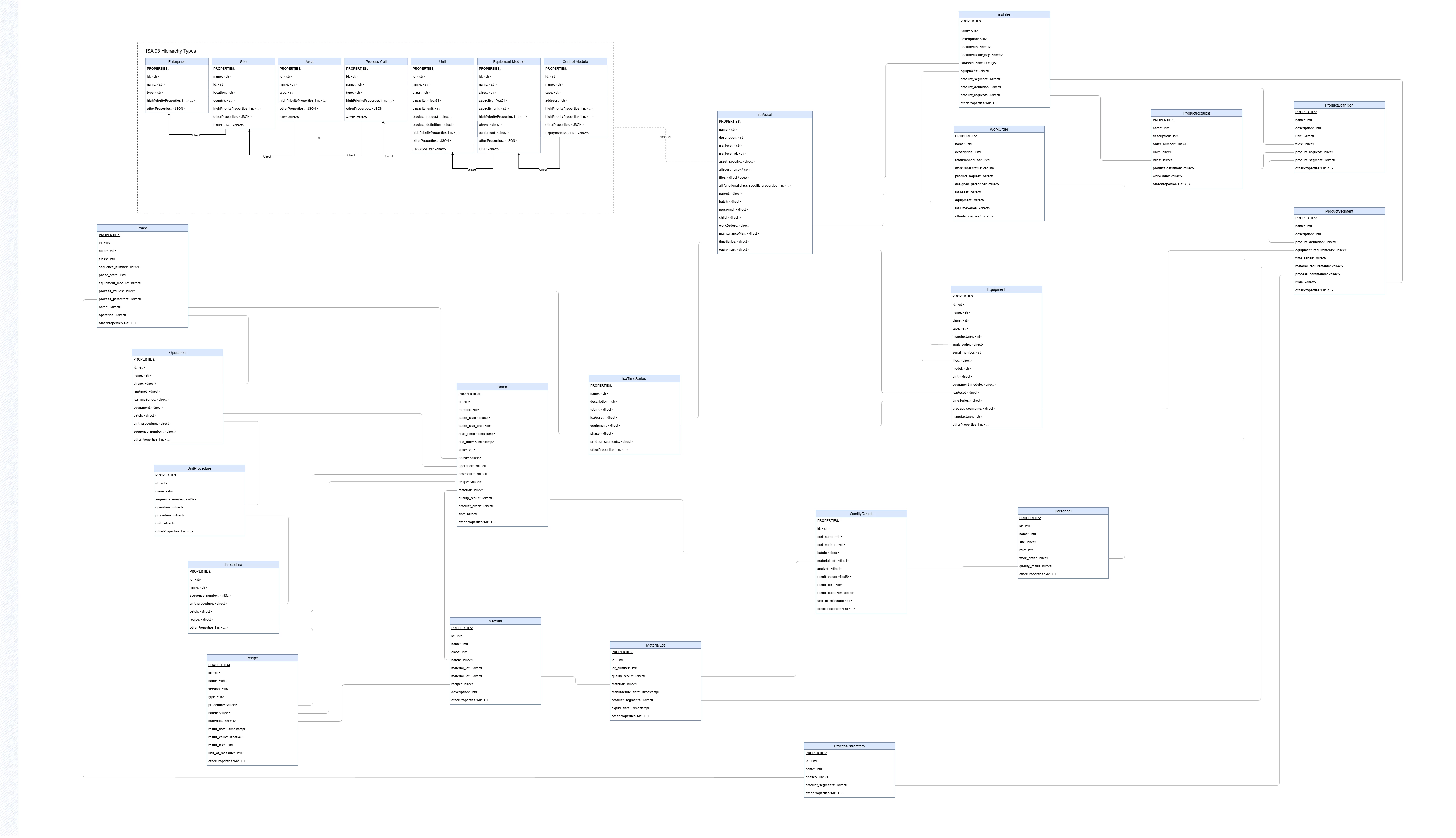 - ISA-88 (ANSI/ISA-88): Batch Control standard that defines procedural models for batch manufacturing. This model implements the ISA-88 procedural hierarchy including Recipe, Procedure, UnitProcedure, Operation, and Phase entities, along with Batch execution tracking.