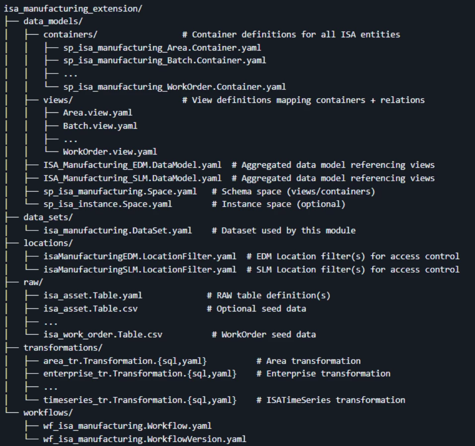 - ISA_Manufacturing.DataModel.yaml: The compositional data model that includes all views from this module and referenced cdf_cdm interfaces.