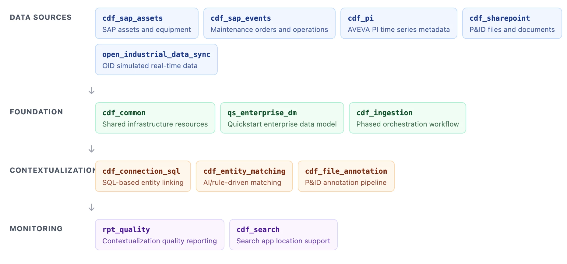 QS DP bundles integrated modules across source ingestion, foundation, contextualization, and monitoring so you can run a full data-to-context pipeline in a predictable sequence.