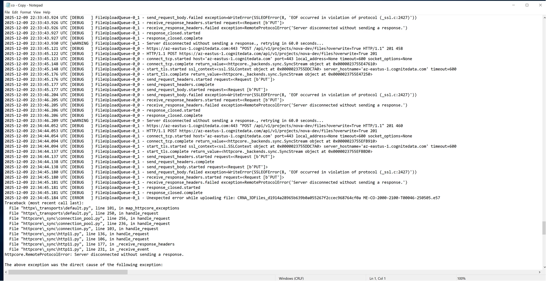 It appears that based on the Windows VM file size, the 3D extractor determines it should use a single-part upload. However, when it attempts to upload the actual file, the process fails because the size exceeds 5 GB