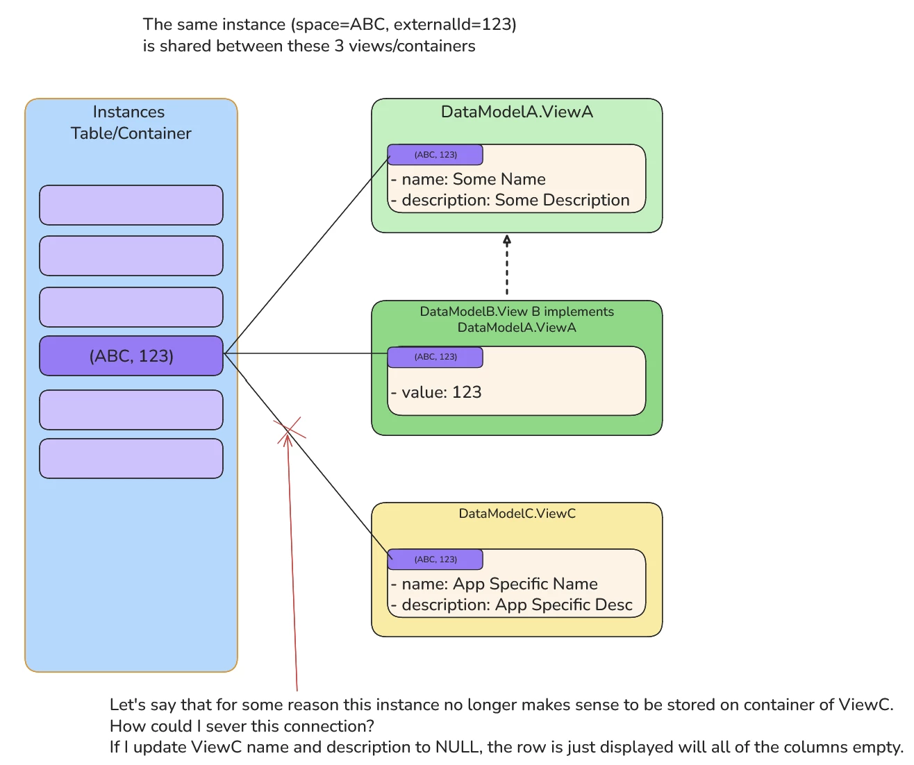I have an instance of externalId “FOO”, space: “FOO-DAT” that have data stored in both views/containers.