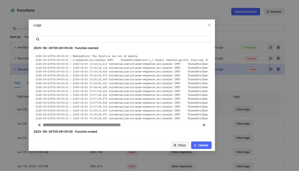 In Cognite Data Fusion (CDF), each project has predefined limits for the number of allowed function calls and concurrent executions. These limits include a fixed memory quota allocated per function call. When a function exceeds this memory limit, CDF will throw the following error: