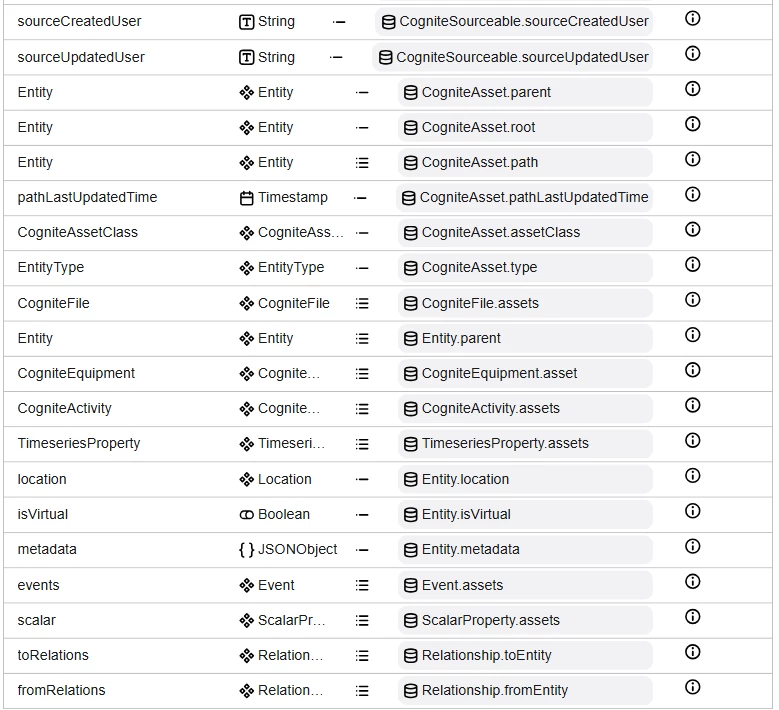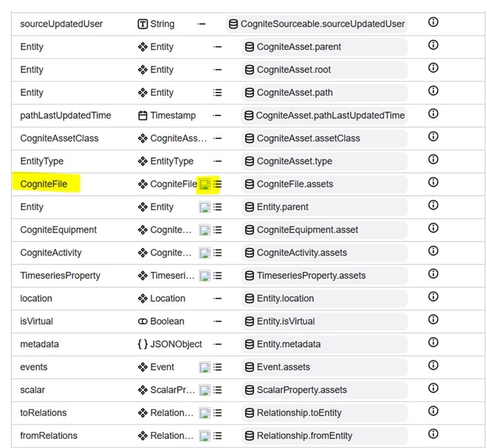 Earlier I have seen that there was on UI of CDF({model_ext_id}/data-models/spaces) page to view the “view” in below visual format. There it was easy way to identify the reverse edges as shown below, it provided small visual clue, but now i am seeing of late, there is no way to identify the reverse edges from the below UI screen. Can we add back something to identify the reverse edges in fact all different type of types individually. Refer field CogniteFile highlighted in yellow.