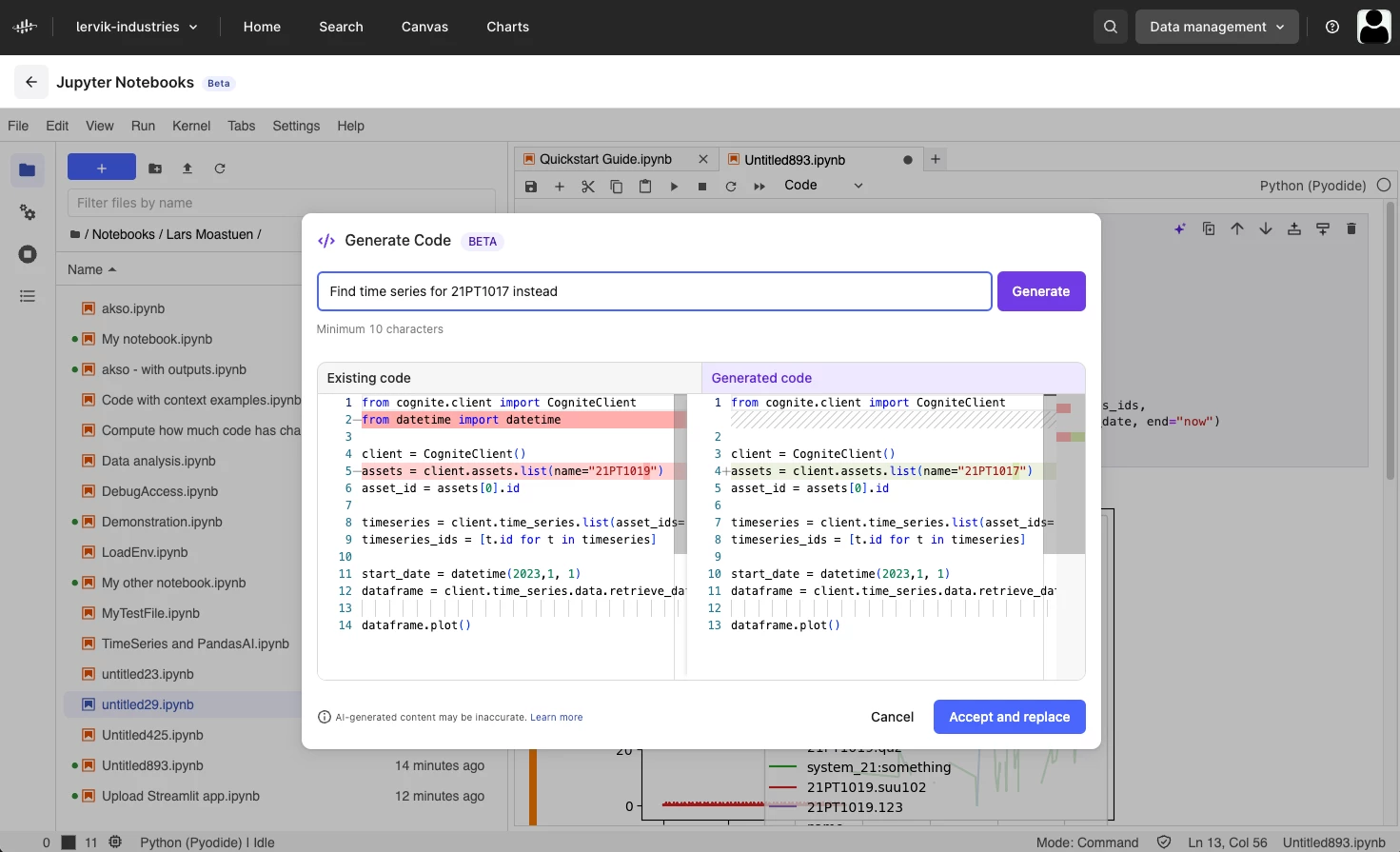 Jupyter Notebook is integrated with Cognite Data Fusion (CDF) and you can create interactive notebook documents that can contain live code, equations, visualizations, and media.