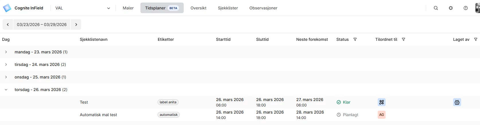 Its a need to have the schedules tab available for all users using InField. As a technician it is beneficial to see all upcoming check lists in a schedule view just as the lead technician is able to today. This gives a much better overview of all lists coming up in the next week.