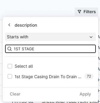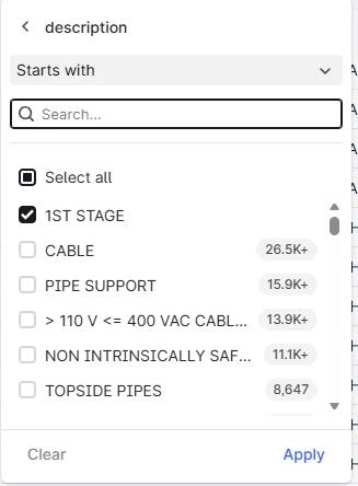 When using filters, the Starts with setting is a powerful functionality allowing you to filter on phrases (limited to the start of the string). However, if the phrase you enter in the search field do not get a match in the “sample set” (not sure how that is extracted, but assume it is the X first instances returned by the list API call), the Apply button is grayed out (shows a red no-parking sign if you hover over it).