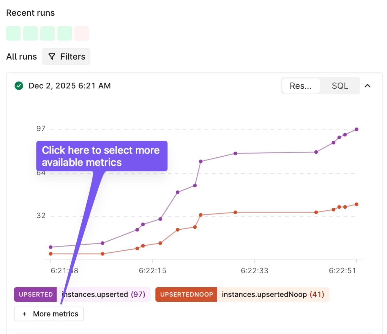 Navigate to the Run history tab in the Transformations UI, and select more metrics as shown in the images below.