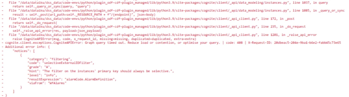 We are querying the view WfAlarms (structure as given below) which has direct reference to alarmCode. When we are querying it for say 3+ months, we get the CogniteApiError, but works fine when it is 1month. This error is seen in our application deployed in production.