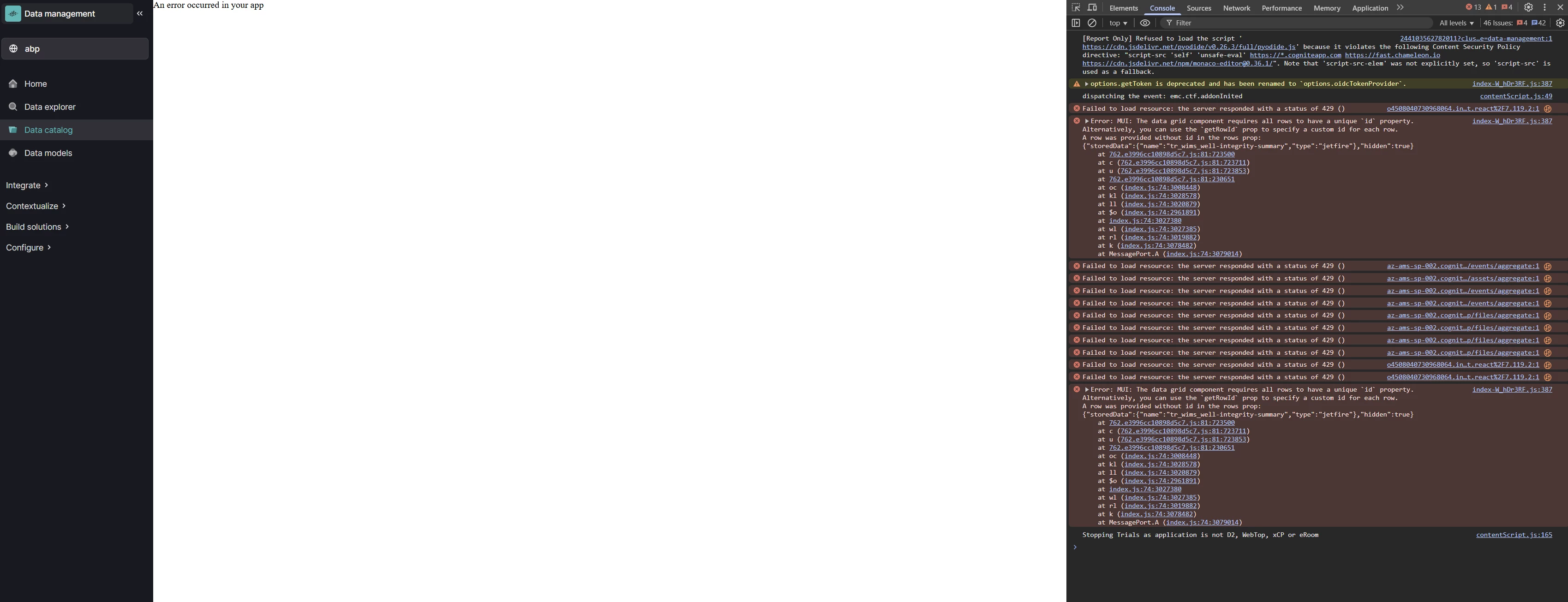 I looked in the network section and saw no errors appear. I am also only able to reproduce the error for the one dataset, WIMS. But I am able to reproduce it for the same dataset in all of our CDF projects.