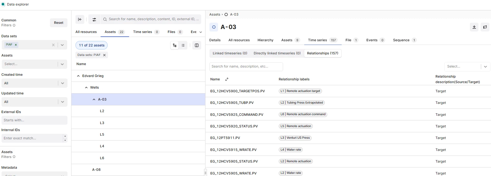 I use “Relationship labels” to contextualize related timeseries, events, sequences from other CDF datasets.