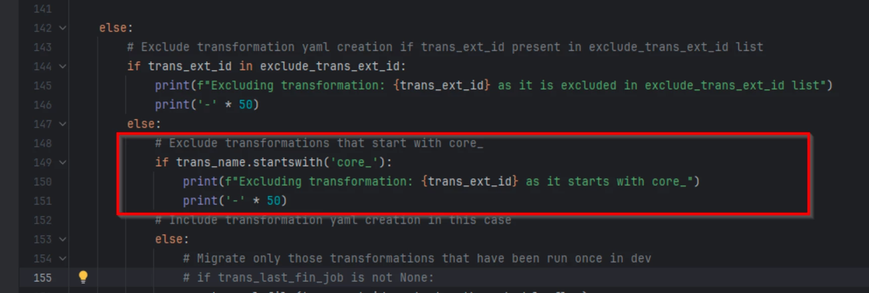 - Then there is a custom logic added to exclude transformations starting with 'core_', which was added for project specific requirements (Core data model related transformations were being maintained manually as they were written for SDM to CDM migration and were being maintained manually)